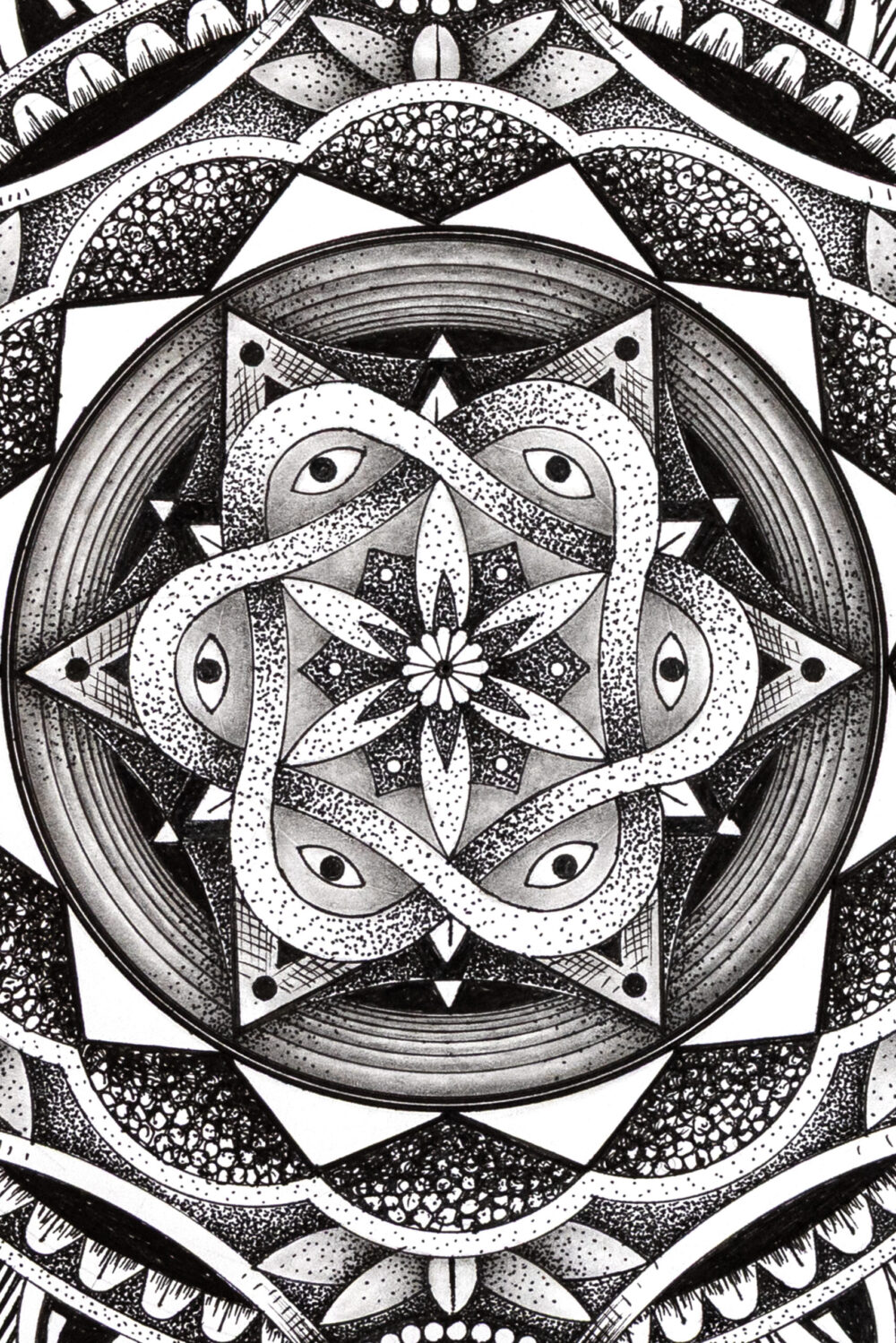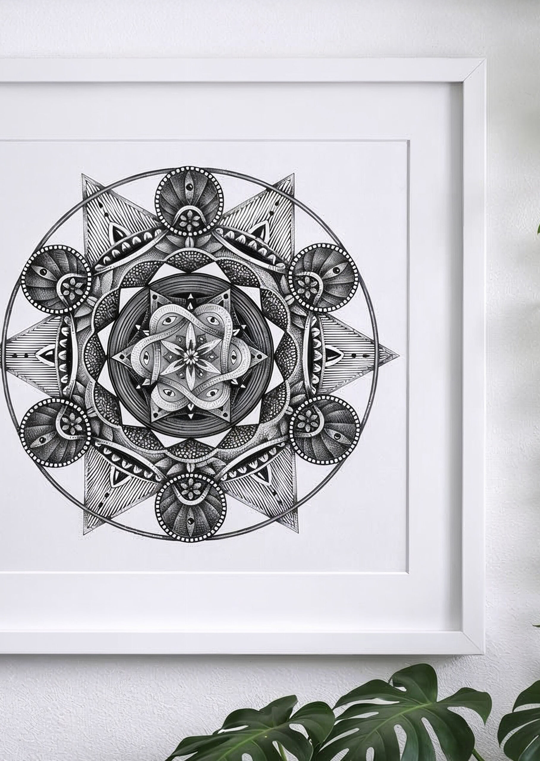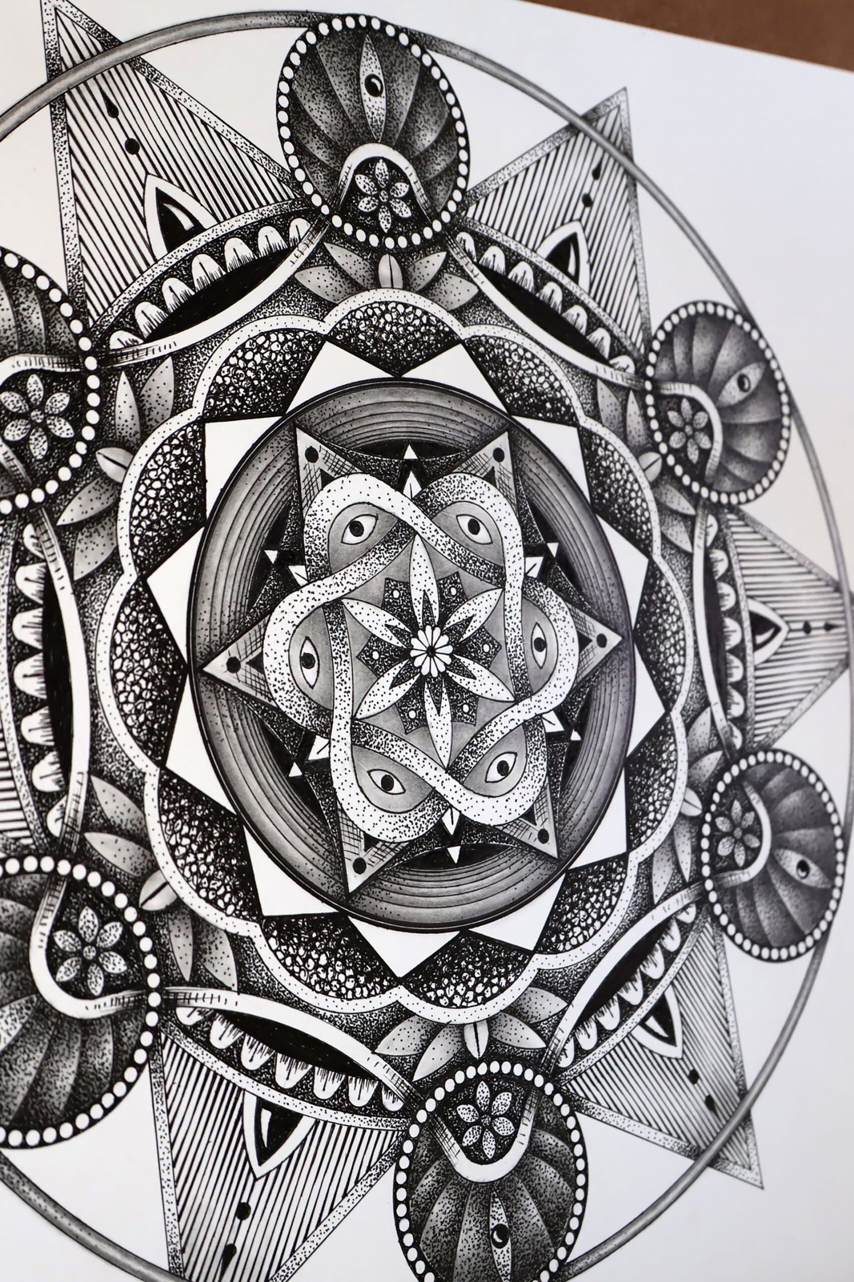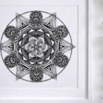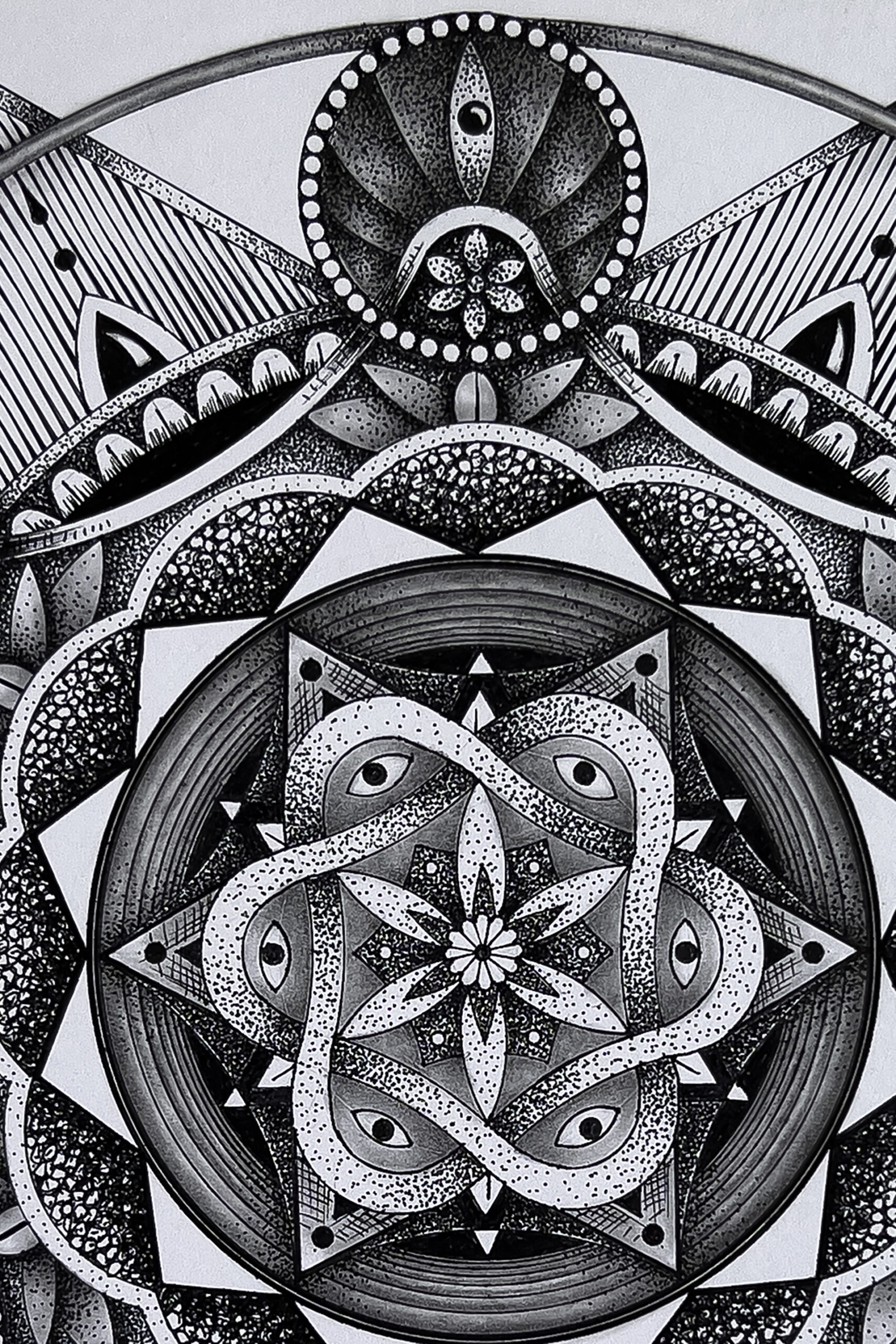 The Mandala was a challenge for me to use my hyper-realistic style into pure geometry. No charcoal — just a touch of graphite for guidelines, then ink. Archival pigment inks sprayed directly onto museum-grade paper. Accurate texture. Real depth.