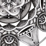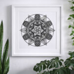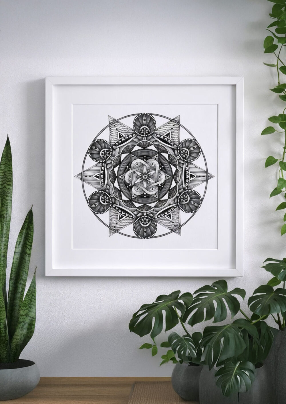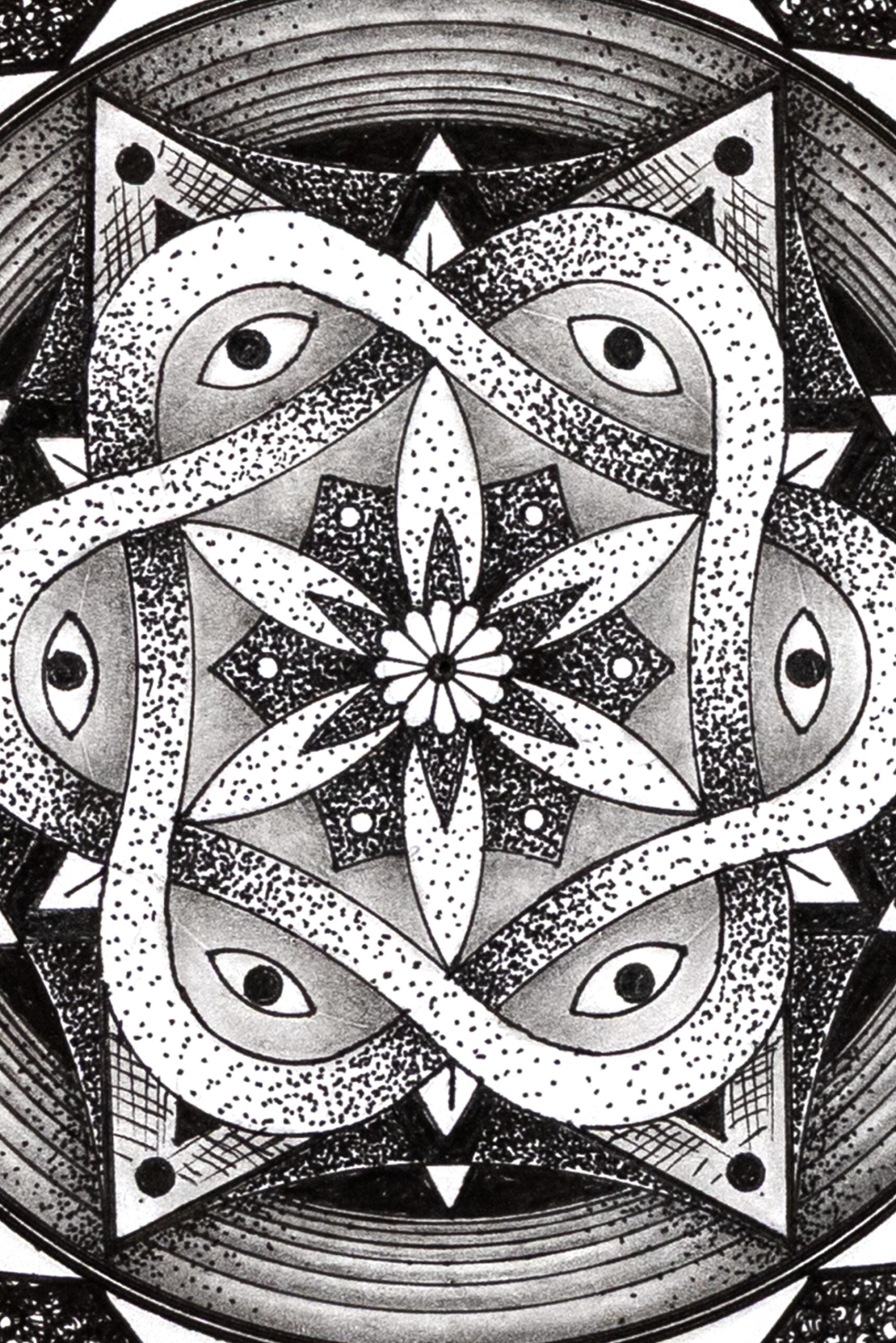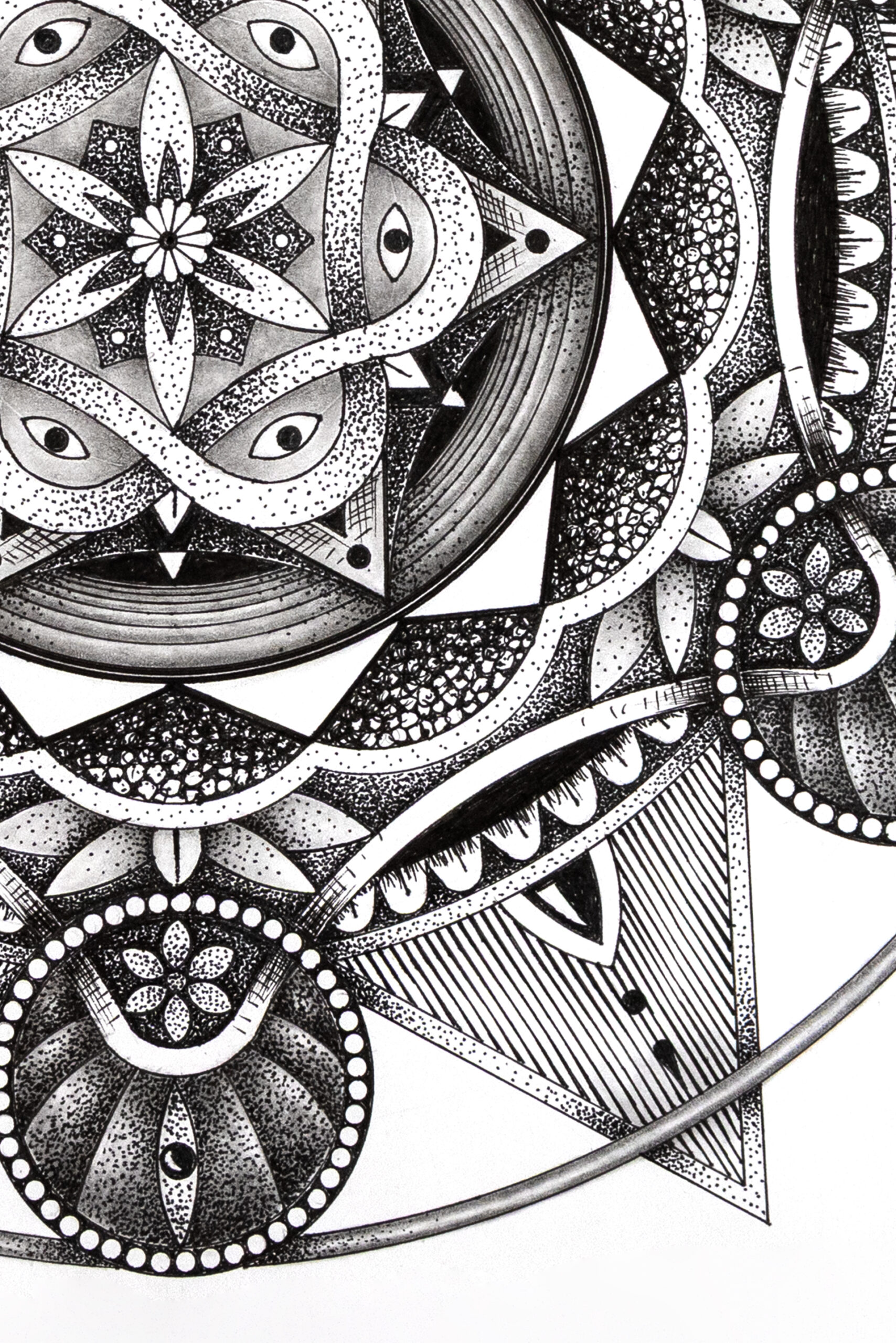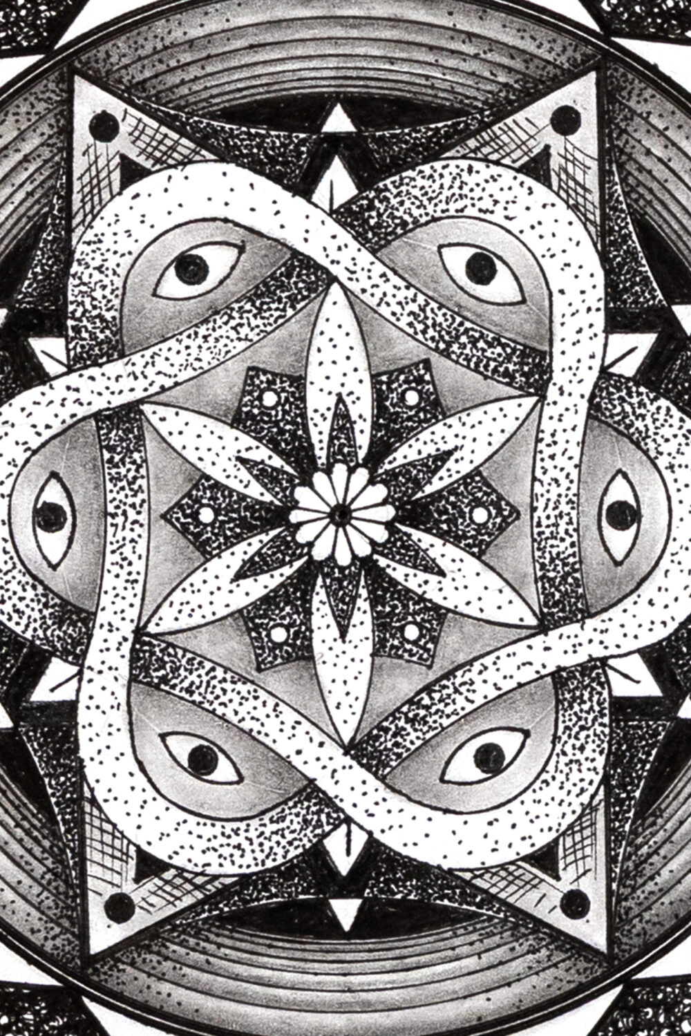 The Mandala was a challenge for me to use my hyper-realistic style into pure geometry. No charcoal — just a touch of graphite for guidelines, then ink. Archival pigment inks sprayed directly onto museum-grade paper. Accurate texture. Real depth.